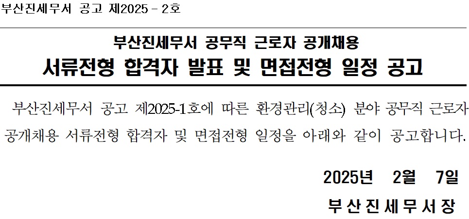 부산진세무서 공무직 근로자 공개채용 서류전형 합격자 발표 및 면접전형 일정 공고