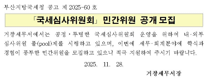 거창세무서 「국세심사위원회」 민간위원 공개모집