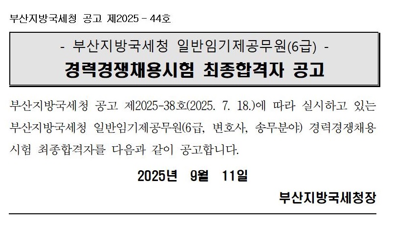 부산지방국세청 일반임기제공무원(6급, 송무) 경력경쟁채용 최종합격자 공고.hwp