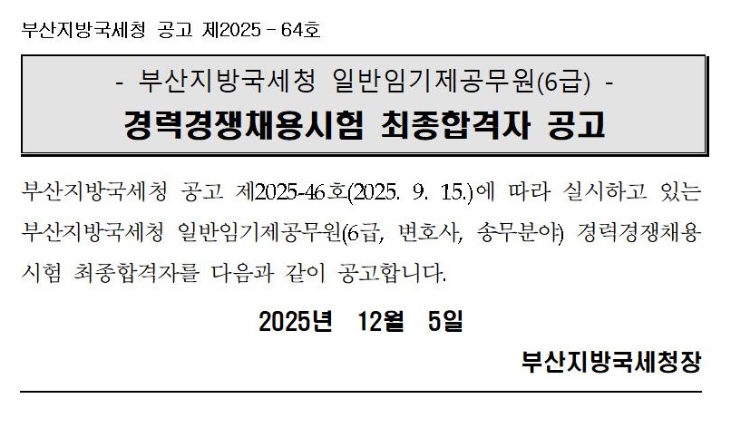 부산지방국세청 일반임기제공무원(6급, 변호사, 송무분야) 경력경쟁채용시험 최종합격자 공고