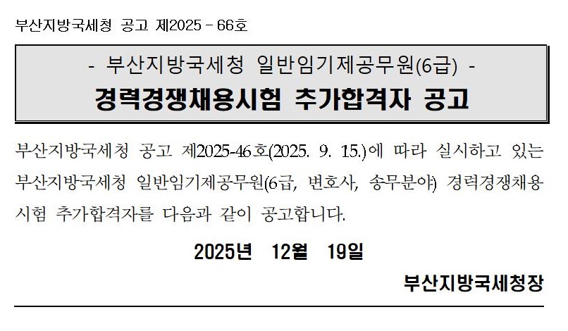 부산지방국세청 일반임기제공무원(6급) 경력경쟁채용시험 추가합격자 공고