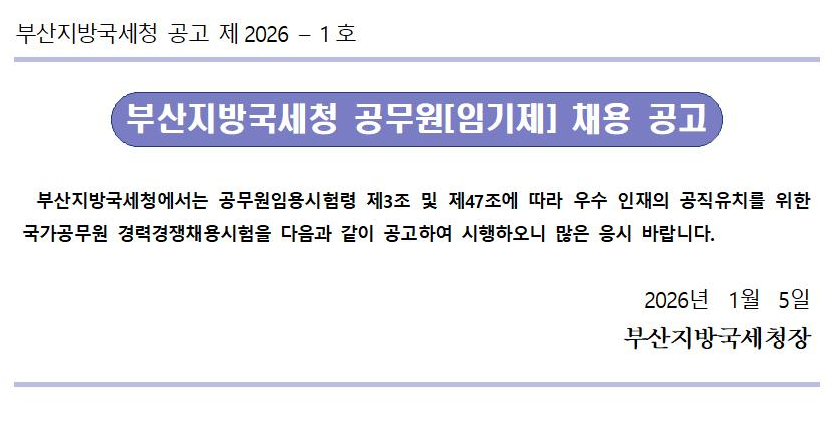 부산지방국세청 일반임기제공무원(6급, 변호사, 조사지원분야) 채용 공고