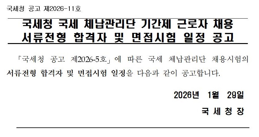 국세청 국세 체납관리단 기간제 근로자 채용 서류전형 합격자 및 면접시험 일정 공고(공고2026-11호).hwpx