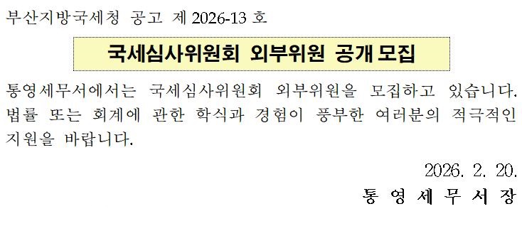 통영세무서 국세심사위원회 외부위원 공개모집