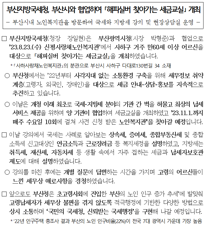 <부산지방국세청, 부산시와 협업하여 「해피실버 찾아가는 세금교실」 개최>