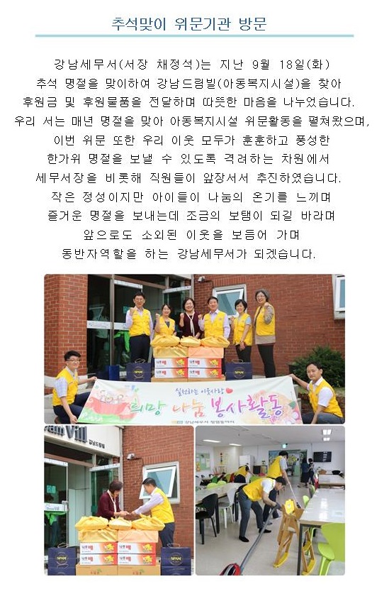 강남세무서, 추석맞이 ‘사랑 나눔’ 사회공헌활동 실시
