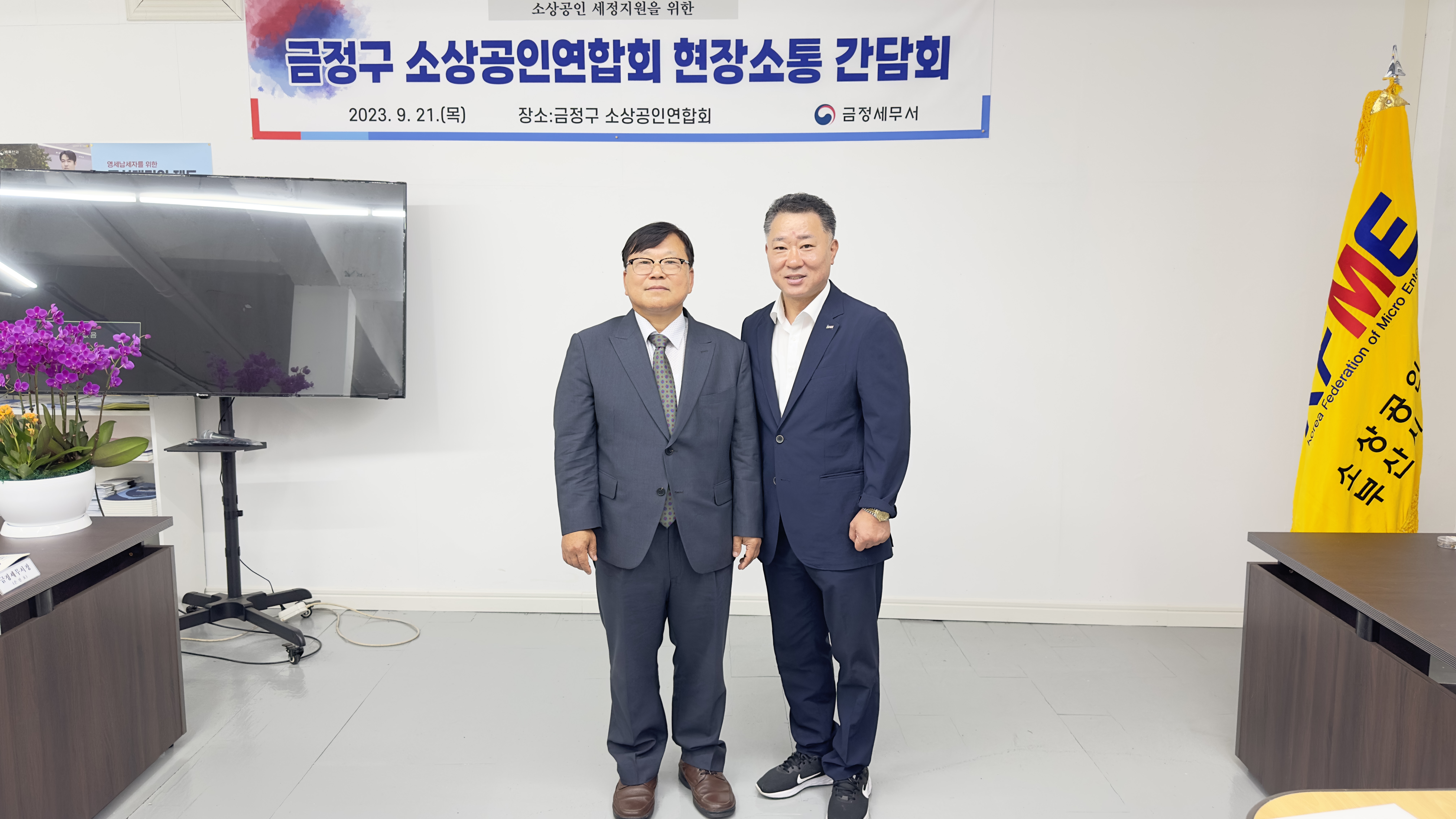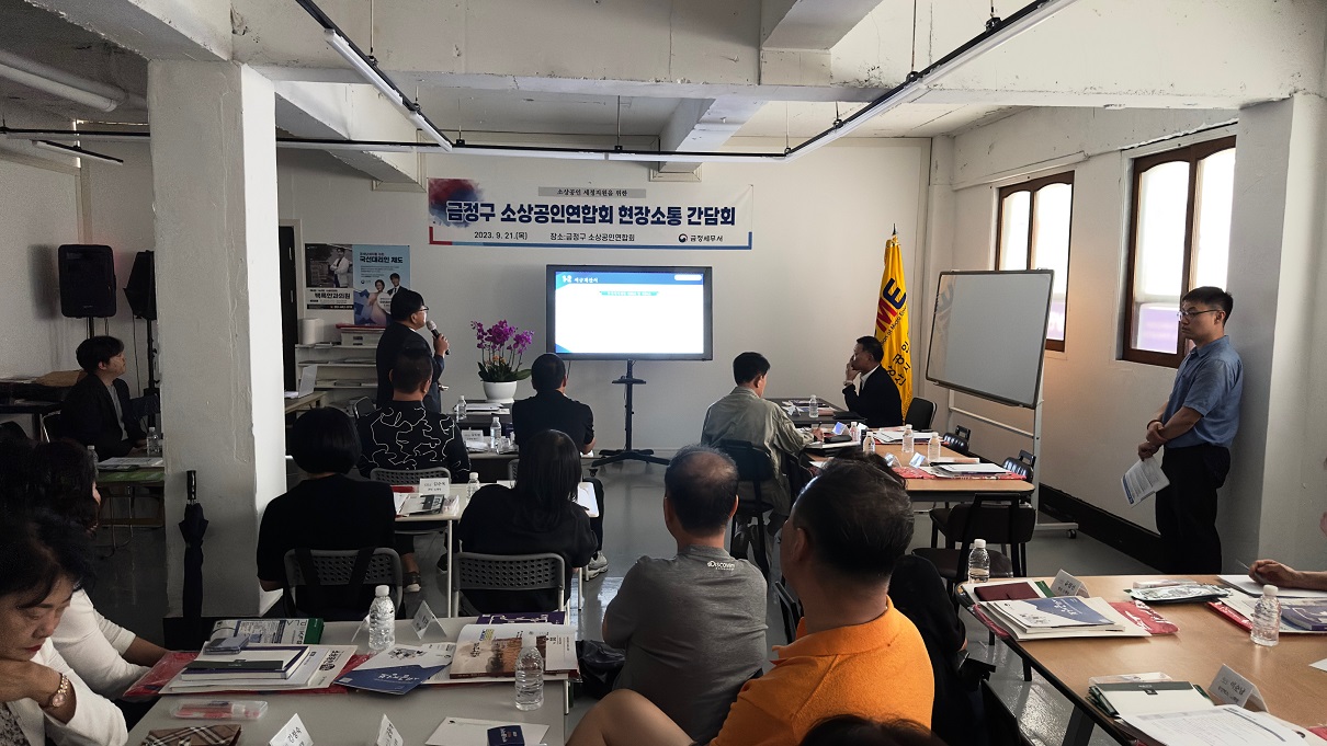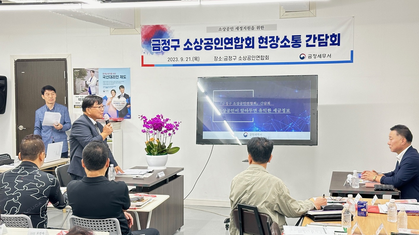 금정세무서장(서장 손진호)은 2023년 9월 21일(목) 소상공인연합회 금정구지회에 방문하여, 코로나 19로 인한 사회적거리두기 등 생활방역으로 피해를 입은 소상공인이 엔데믹 시대에도 고물가, 고금리 등으로 여전히 어려움을 겪고 있는 시점에 소상공인의 어려움을 듣고 맞춤형 세정지원을 위한 간담회를 개최 하여 '소상공인이 알아두면 유익한 세금정보'에 대해 강의하고 참석자로부터 질의.건의사항을 청취하고 답변하는 시간을 가졌습니다.