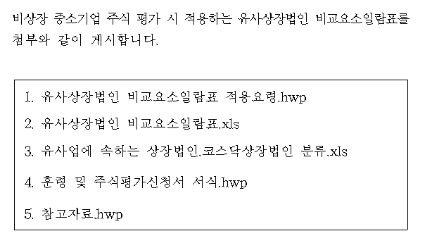 비상장 중소기업 주식 평가 시 적용하는 유사상장법인 비교요소일람표를 첨부와 같이 게시합니다. 1. 유사상장법인 비교요소일람표 적용요령.hwp 2. 유사상장법인 비교요소일람표.xls 3. 유사업에 속하는 상장법인.코스닥상장법인 분류.xls 4. 훈령 및 주식평가신청서 서식.hwp 5. 참고자료.hwp