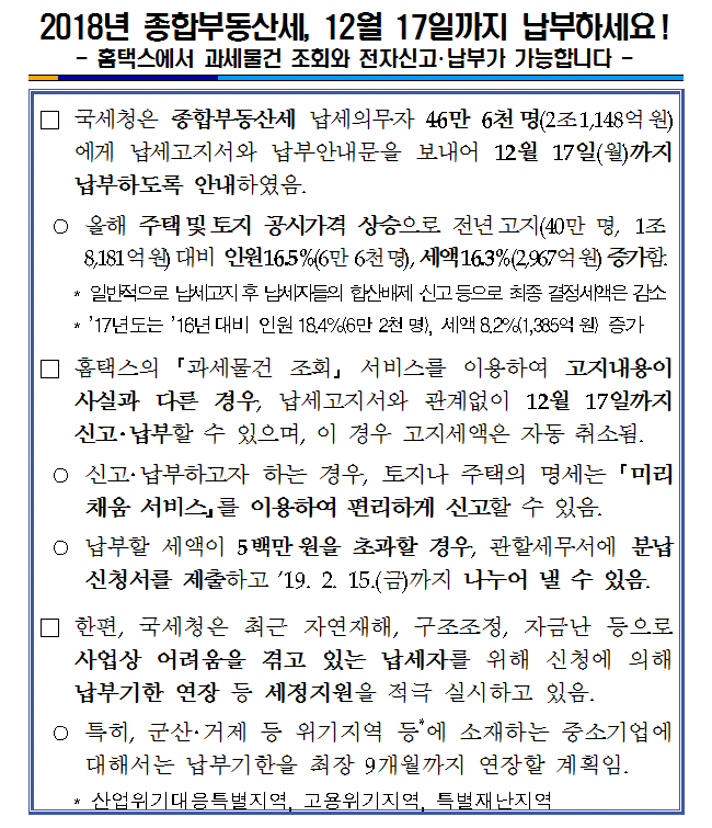 2018년 종합부동산세, 12월 17일까지 납부하세요!