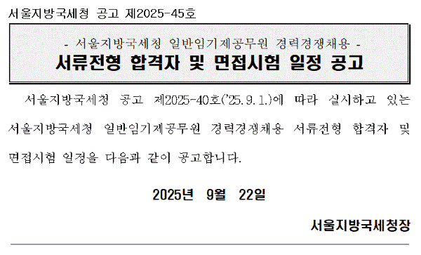 서울지방국세청 공고 제2025-45호 입니다. 서울지방국세청 공고 제2025-40호에 따라 실시하고 있는 서울지방국세청 일반임기제공무원 경력경쟁채용 서류전형 합격자 및 면접시험 일정을 다음과 같이 공고합니다. 2025년 9월 22일 서울지방국세청장