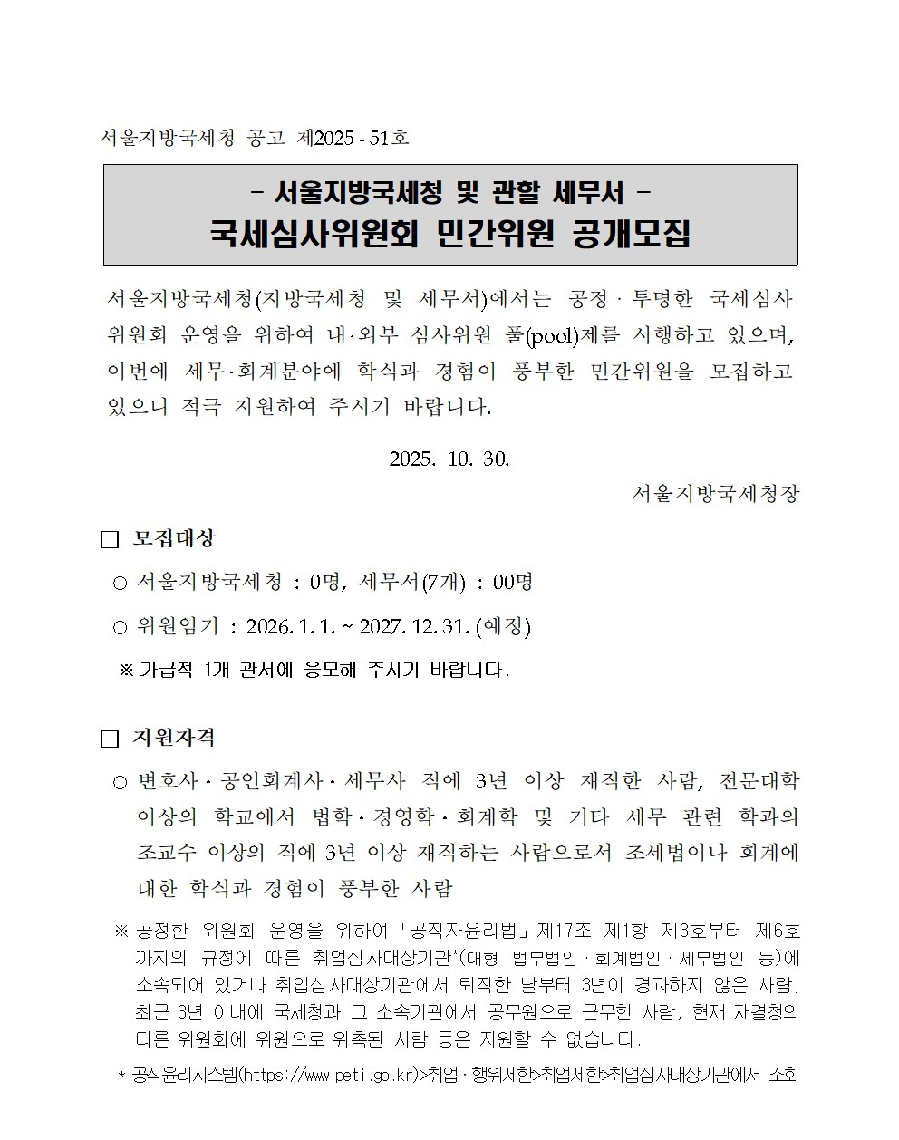 서울지방국세청(지방국세청 및 세무서)에서는 공정, 투명한 국세심사위원회 운영을 위하여 내, 외부 심사위원 풀(pool)제를 시행하고 있으며, 이번에 세무, 회계분야에 학식과 경험이 풍부한 민간위원을 모집하고 있으니 적극 지원하여 주시기 바랍니다.