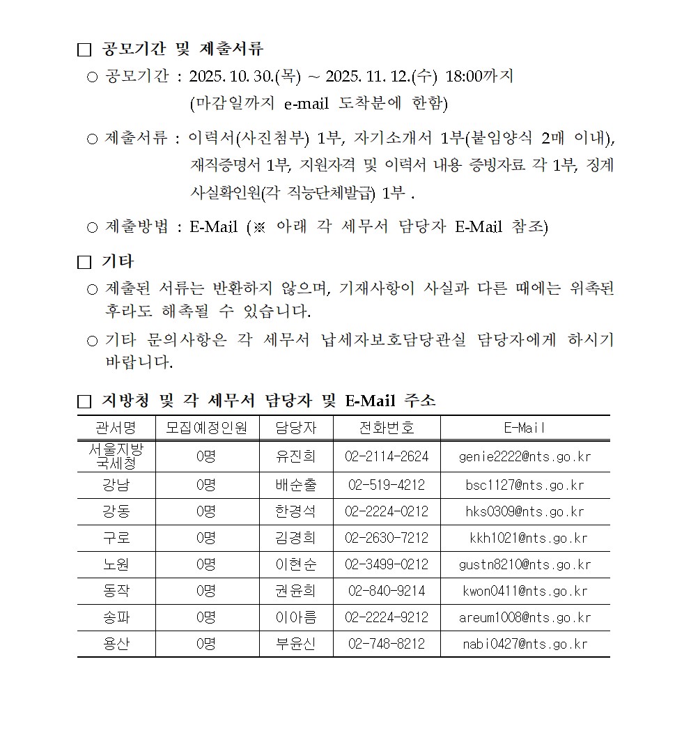 모집대상은 서울지방국세청 0명, 세무서(7개) 00명이며 위원 임기는 2026년 1월 1일부터 2027년 12월 31일까지 예정입니다. 가급적 1개 관서에 응모해 주시기 바랍니다.