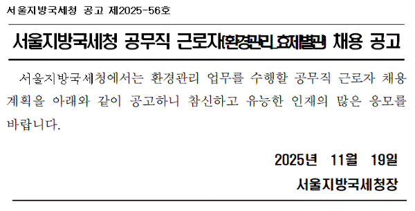 서울지방국세청 공고 제2025-56호 입니다. 서울지방국세청에서는 환경관리 업무를 수행할 공무직 근로자 채용 계획을 아래와 같이 공고하니 참신하고 유능한 인재의 많은 응모를 바랍니다. 2025년 11월 19일 서울지방국세청장